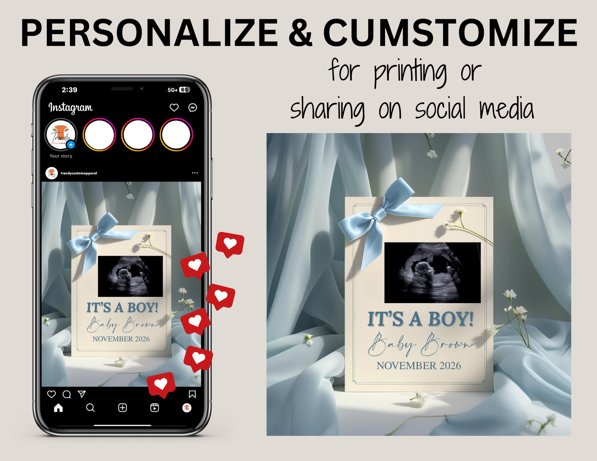 Digital Baby Boy Pregnancy Announcement, It’s A Boy, Gender Reveal, Customizable Personalized Editable Template