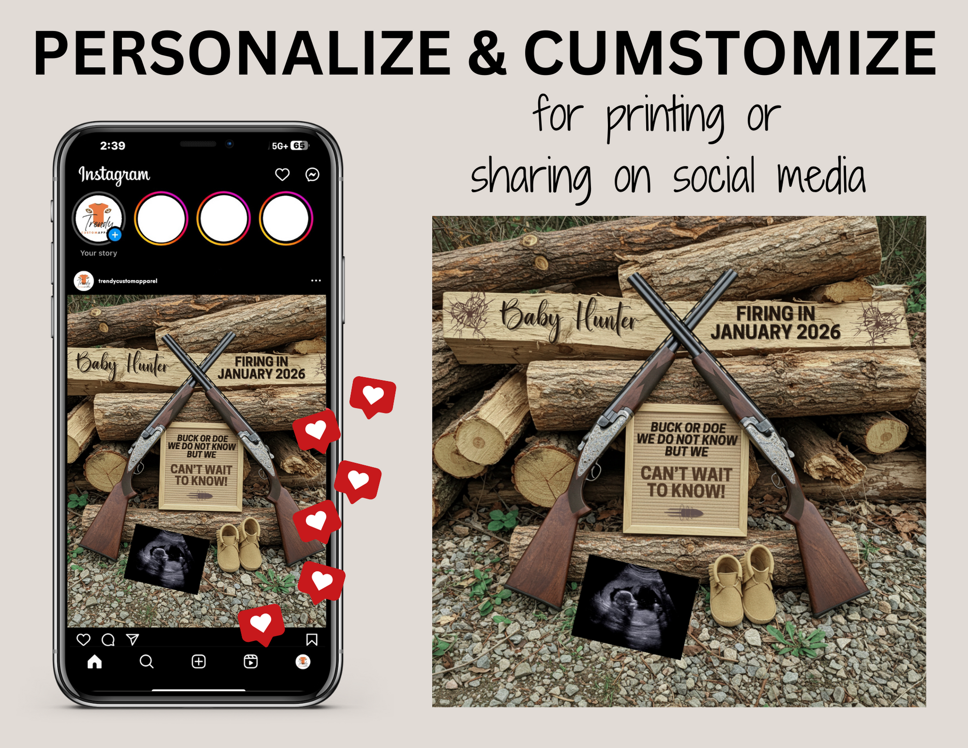 Digital Rifle Themed Pregnancy Announcement, Busk or Doe, Customizable, Downloadable Editable Template