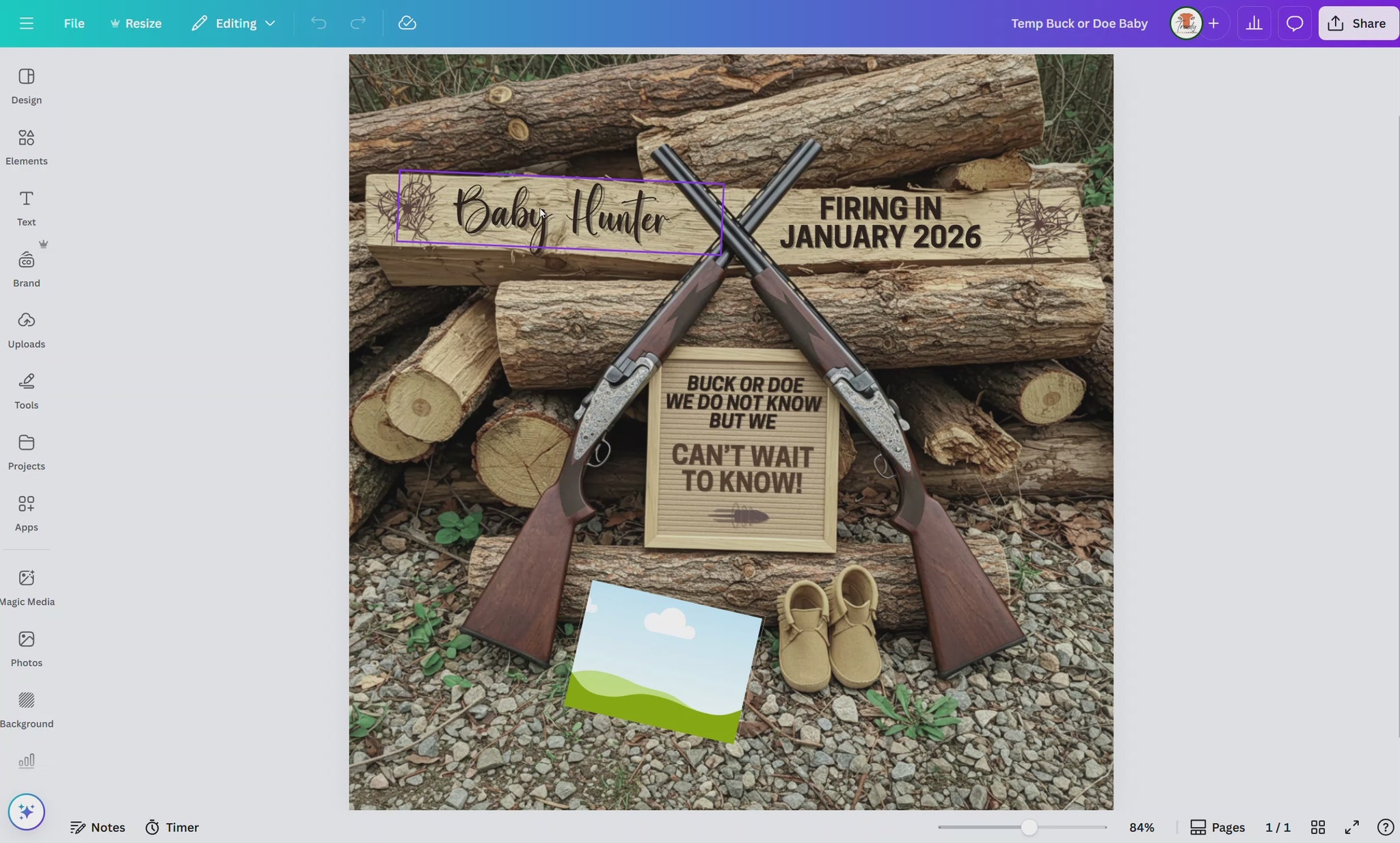 Surprise your family and friends with a fun and adorable way to announce your pregnancy. With our customizable Rifle/Shotgun Hunting-themed template, you have the freedom to edit the details and make it uniquely yours.