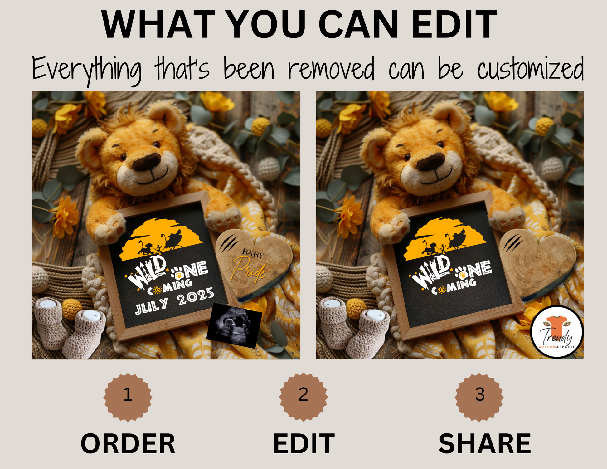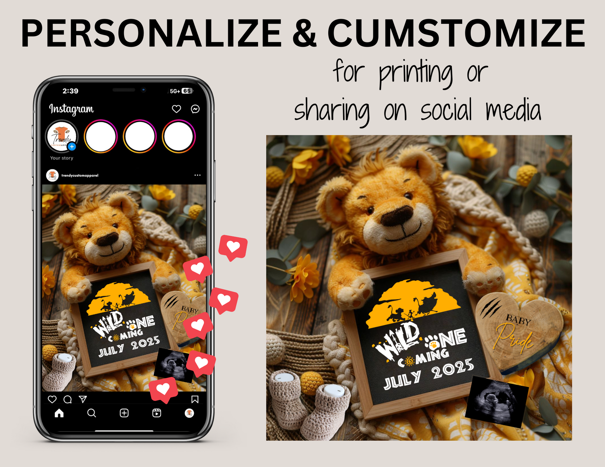 Digital Pregnancy Announcement, Wild One Coming, Customizable Disney Lion King Themed, Personalized Editable Template